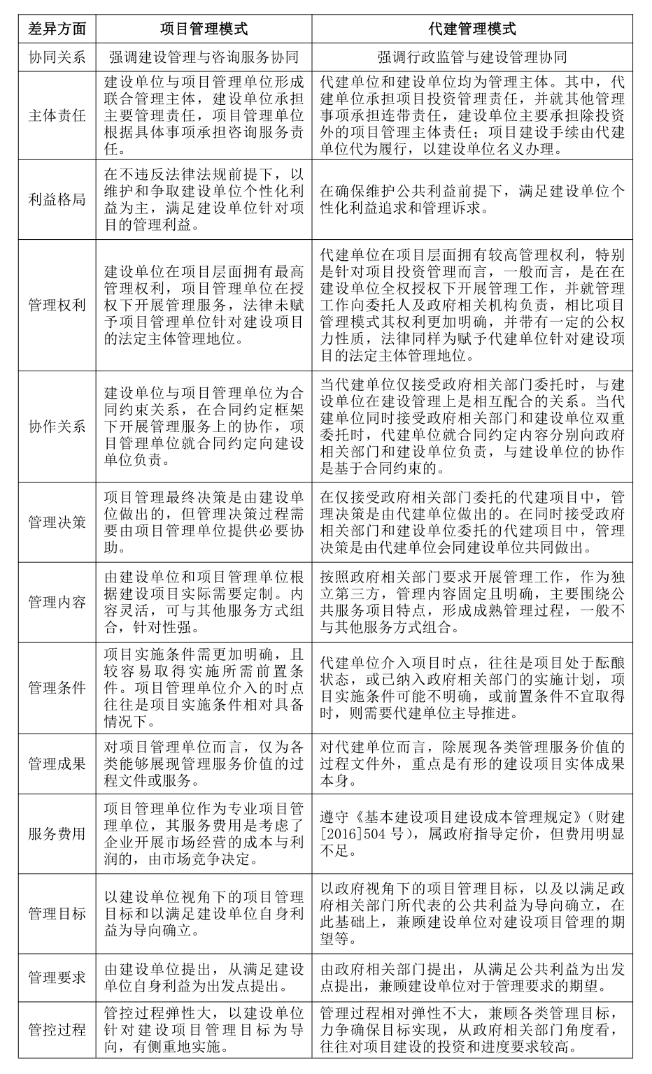 由于在管理初衷和性质上的不同,项目管理与代建管理模式的差异是明显的,详见表1所示。