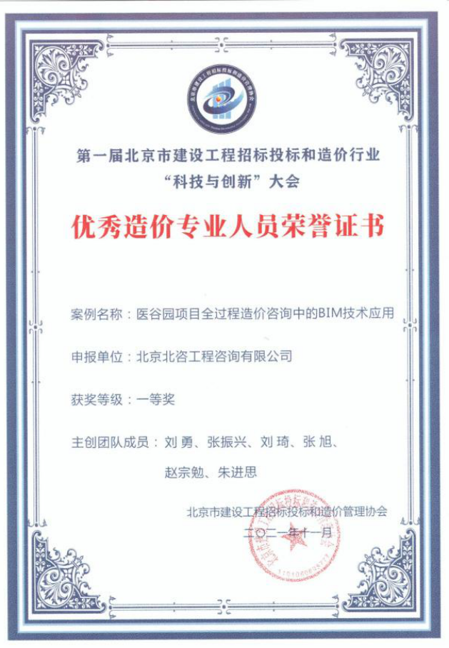 第一届北京市建设工程招标投标和造价行业“科技与创新”大会优秀造价专业人员荣誉证书