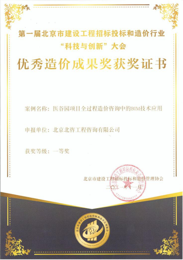 第一届北京市建设工程招标投标和造价行业“科技与创新”大会优秀造价成果奖获奖一等奖证书