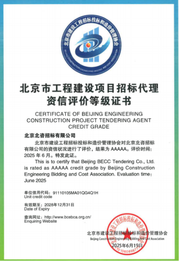 公司在开展招标业务之初,即非常重视相关资质的认证和申请,先后获得了中华人民共和国住房和城乡建设部颁发的工程招标代理甲级资质证书、财政部颁发的政府采购代理机构甲级资质证书、中华人民共和国发展和改革委员会颁发的中央投资项目招标代理机构乙级证书和北京市住房和城乡建设委员会颁发的工程造价咨询企业资质证书。在招标公司成立后已连续两次取得了北京市建设工程招标投标和造价管理协会颁发的招标代理资信评价5A级证书。