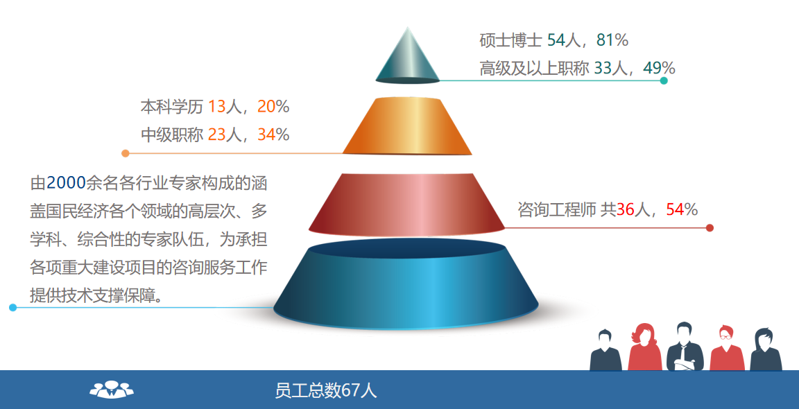 部门现有专业咨询团队67人,形成以中青年为主力、高学历、高职称的专业梯队,其中博士及博士后3人,硕士以上学历占比超80%,30-45岁员工占比超75%,高级及以上职称33人,持有咨询工程师(投资)、一级注册结构工程师、一级造价工程师、一级注册建造师、注册城市规划师、土地估价师等各类职业资格人员65人次,累计获得各级优秀咨询成果奖及行业表彰数百项。