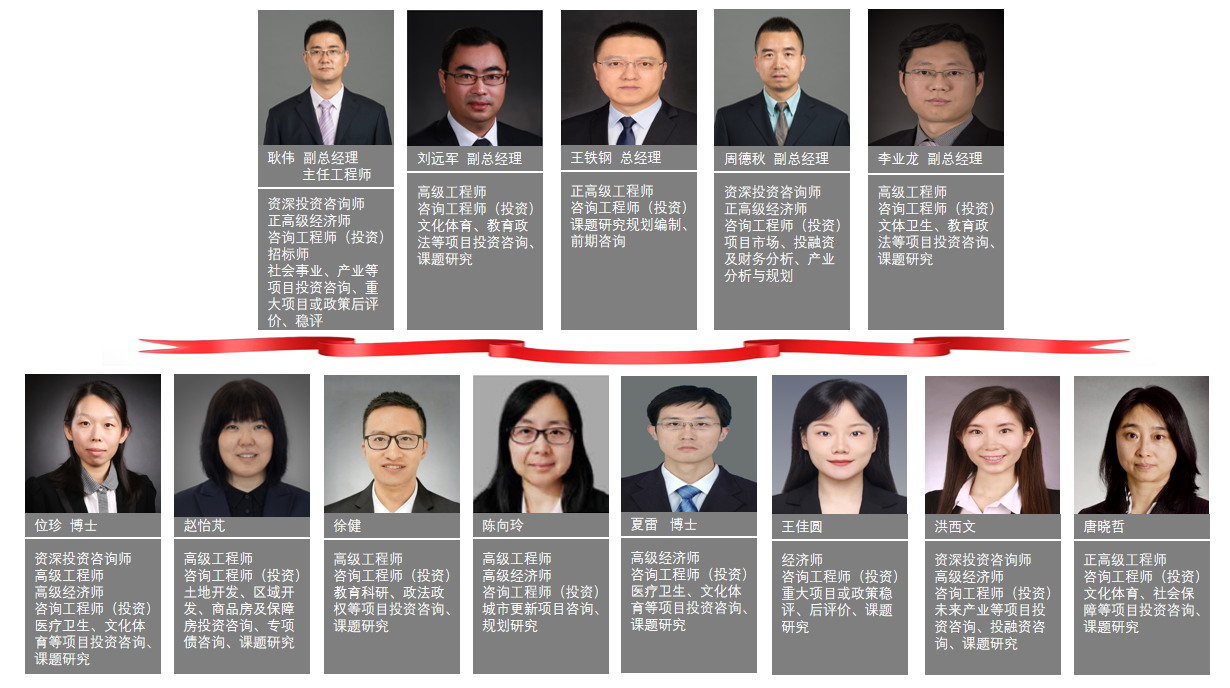 投资咨询事业部是前期咨询业务板块的核心部门之一,专注于为政府和企业提供公共服务、新兴产业与未来产业、土地资源综合开发、城市更新、风险评估等领域的咨询服务,在北京市重大战略研究、重点项目决策等方面发挥着关键智库作用。部门实行专业化、规模化运营管理,内设七个二级业务部门,即文体卫生咨询部、教育政法咨询部、房地产咨询部、城市更新咨询中心、产业创新咨询部、未来产业研究部和社会稳定风险咨询部(后评价部)。
