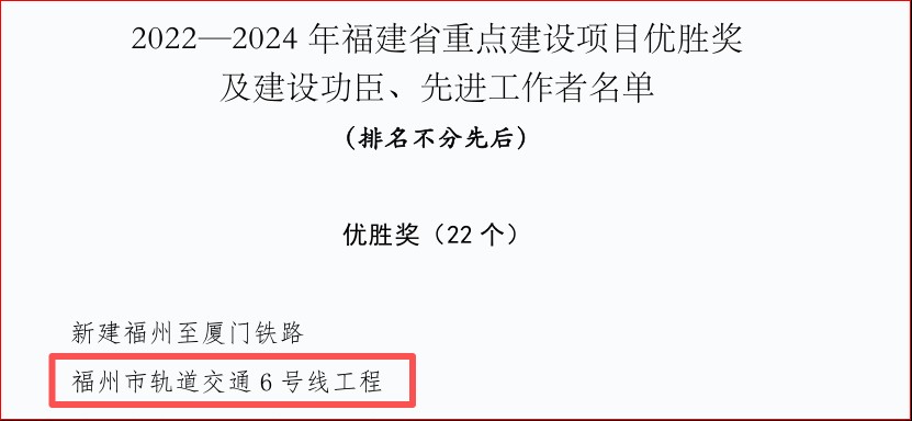 近日,由北咨监理公司负责监理的福州市轨道交通6号线工程,荣获2022—2024年福建省重点建设项目优胜奖。此次表彰是福建省人民政府为表彰先进典型、弘扬奋斗精神而开展的专项评选,旨在以高水平项目建设助推全省经济社会高质量发展。本次共22个项目获奖,彰显了福州地铁6号线工程的行业价值与北咨监理公司的专业实力。